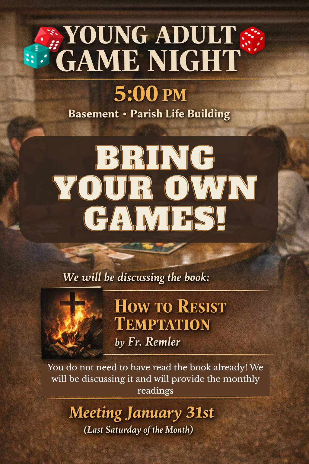 Join us for monthly Game Nights and book discussions, held on the last Saturday of each month at 5:30 PM in the basement of the Parish Life Center Building.