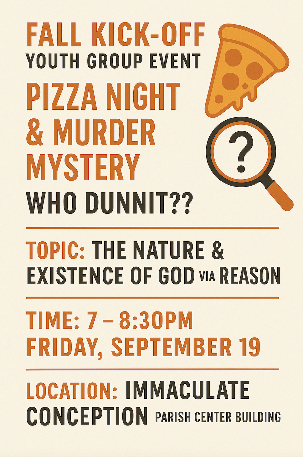 Join us for a night of fun with our fall youth group kick-off! Fellowship, Bible study, and our highlight event: Pizza Night & Murder Mystery - Can you find out "who dunnit"??